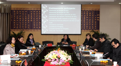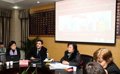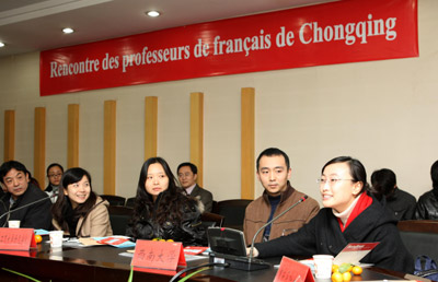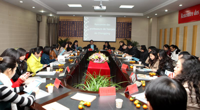 时逢“2011中国法语年”,为促进重庆市法语教学的发展,由四川外语学院法语系主办的“2011中国法语年·重庆法语周”系列活动之一的“重庆市法语教学机构教学经验交流会”于12月12日下午在川外宏文楼会议室召开。共有来自川外法语系、川外应用外语学院法语专业、川外国际教育学院法语项目、重庆市法语联盟、重庆工商大学法语专业、三峡大学法语专业及重庆医科大学、重庆大学、西南大学、重庆师范大学等法语教学机构的代表应邀参加交流会。北京法语联盟、法国驻成都总领事馆、法国教育服务中心(成都)也派代表出席了会议。