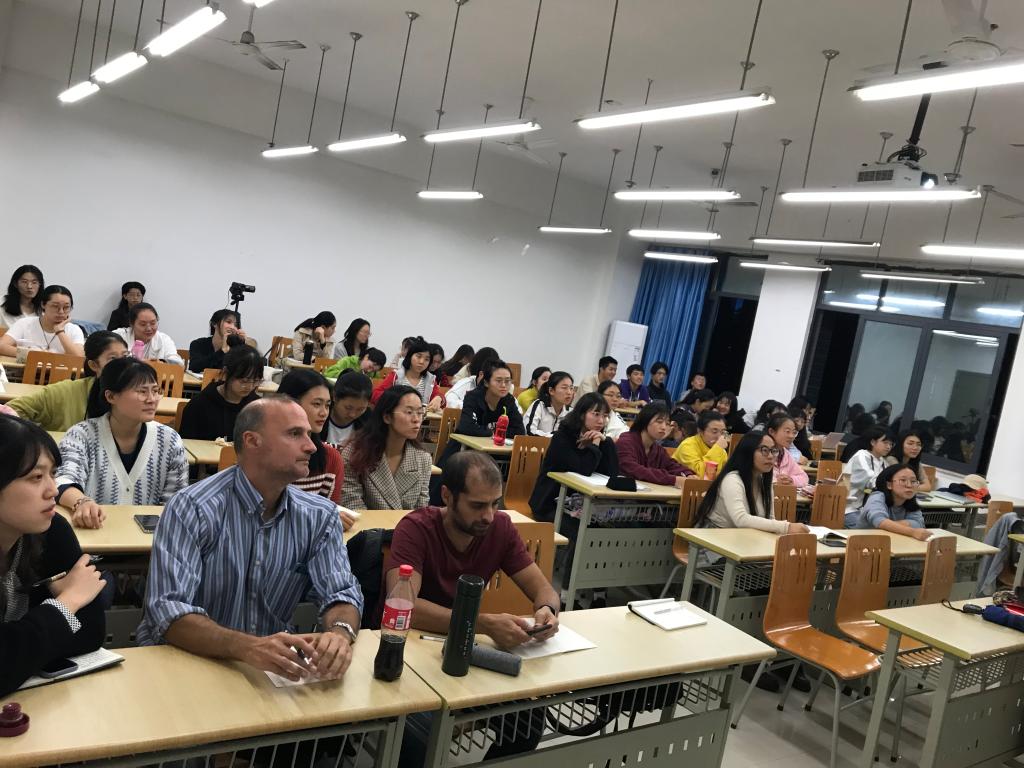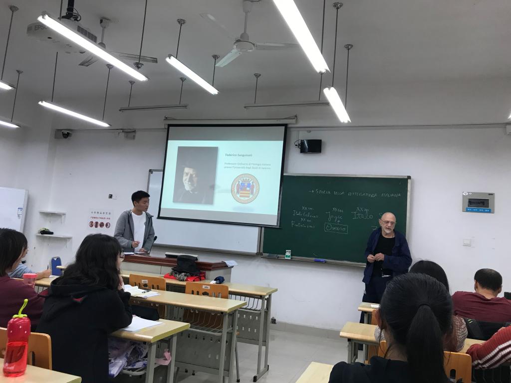 2019年10月22日19:00,意大利著名学者、萨雷勒诺大学Federico Sanguineti教授应邀在西区教学楼C307做了一场主题为“意大利文学的主流”的讲座,此次讲座由陈英老师主持,主要面向我系意大利语专业的师生。由2016级赵向扬、蒋寒立和范月华同学担任现场翻译。