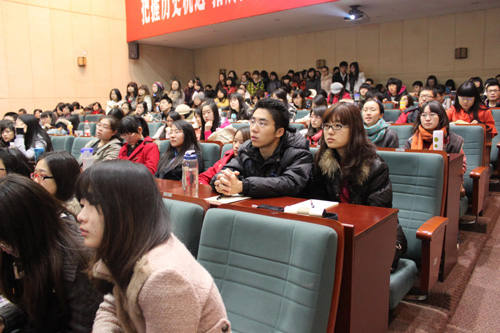2011年12月13日上午10点整,本届法语文化周的首场讲座在宏文楼报告厅举行。讲座以《感知法语》为题,由四川外语学院董事长李克勇教授主讲,川外法语系主任尹丽教授主持。法语系师生、许多对法语怀有浓厚兴趣的老师和同学们纷纷前来聆听讲座,整个宏文楼报告厅座无虚席。