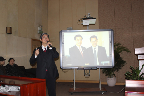 李克勇教授以“中国法语年”的官方影片引出本场讲座。通过影片,李董事长为大家讲解了法语的几大特点——“浪漫”、“温柔”、“美丽”、“诗意”以及“精确”。而法语的悠久历史以及自身的魅力也由此体现得淋漓尽致。其中,李董事长着重指出法语“精确”性的特点,并特地以《最后一课》的法语原文为例,让大家领略到了法语的精妙,以及法国人对于法语这门语言的热爱之情。