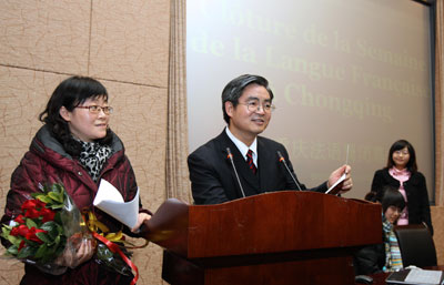 exposé决赛结束后,杨少琳书记代表重庆法语周主办单位感谢各方合作单位,总结了此次法语周的成绩,并邀请川外董事长李克勇教授致闭幕辞。李董事长对本届重庆法语文化周的成功举办表示祝贺,对为这次活动做出积极贡献的师生们表示由衷的感谢,并展望了中法文化交流未来的美好蓝图。随后,由法语系主任尹丽和重庆法盟主任雷玛丽为法语文化周开幕式晚会获奖节目颁奖并合影留念。至此,本届重庆法语周圆满落幕。