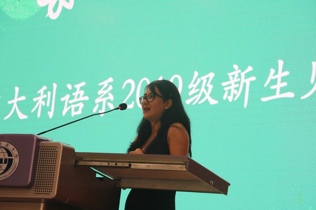 第二位发言的是意大利语外教Vincenza Armiento,她用流利的英语介绍了自己,并现场教学简单的意大利语“你好”,同学们大都第一次接触这门古老而优雅的语言,当稚嫩青涩的卷舌音在大厅四处响起,老师和同学们都忍俊不禁,现场气氛一片融洽。