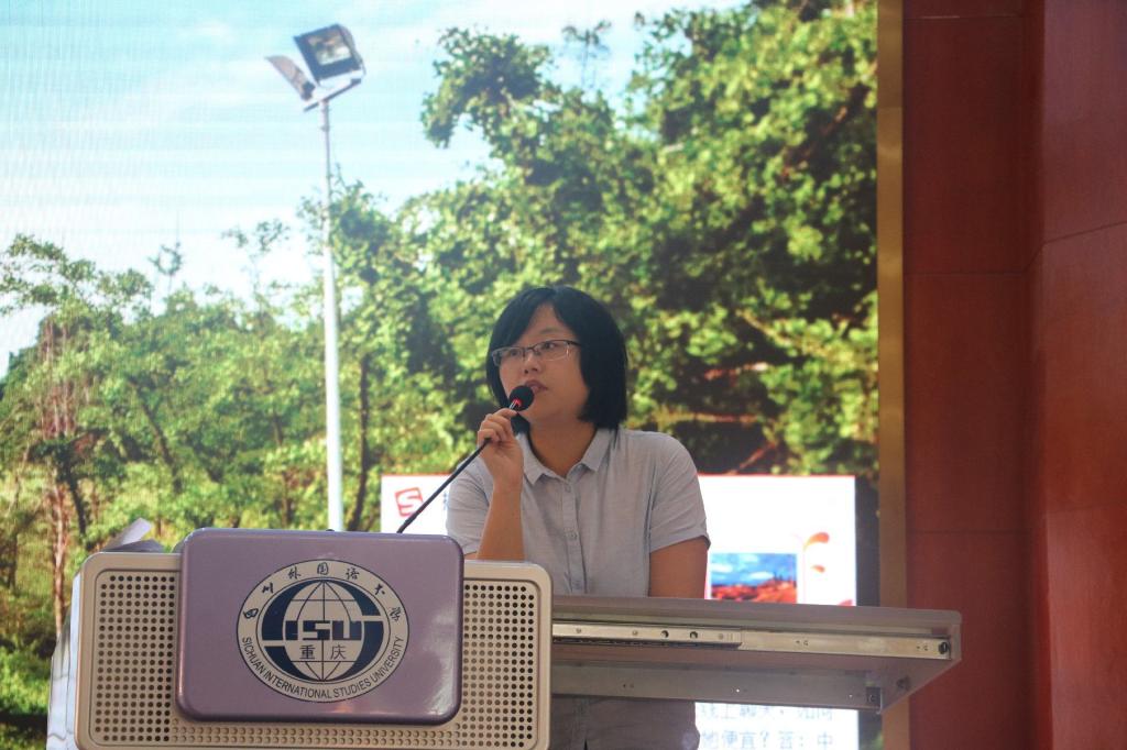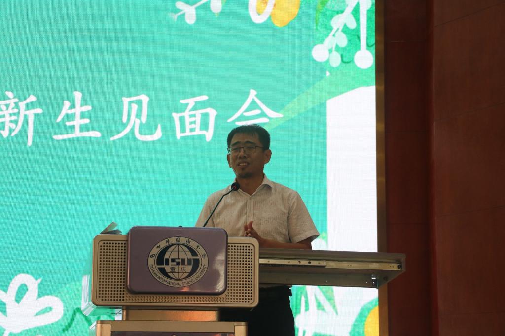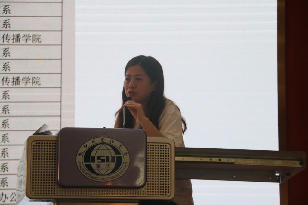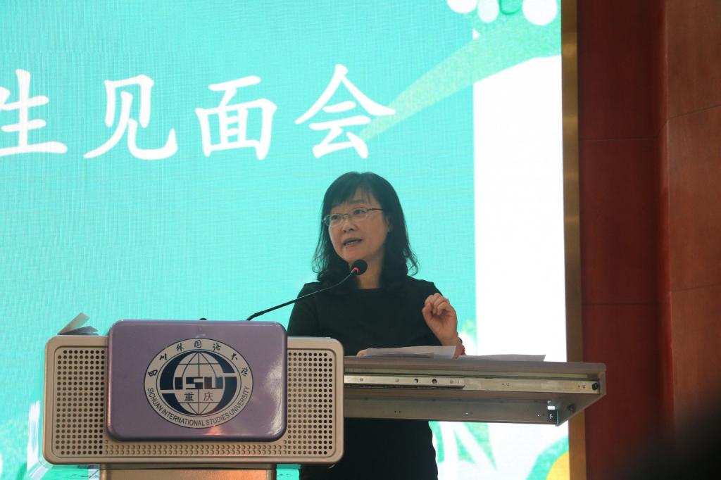 在同学们热烈的掌声中,系主任、党总支书记杨少琳教授上台发言。“忆往昔峥嵘,展未来征程”,杨老师首先用简洁干练的语言向同学们介绍了川外悠久的建校历史以及法意语系的建系历程,紧接着,她强调大学是一个全新的起点,叮嘱同学们要过有“获得感”的老员工活,要学有所成,也要积极参加活动,拓宽视野,做“立足本国,放眼世界”的川外学子。